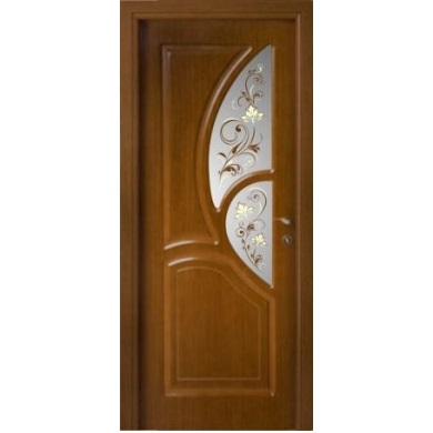 Остекленное дверное полотно из серии «Муза». Покрытие — натуральный шпон. Цвет полотна двери —орех. Стекло с рисунком, выполненным по технологии "фьюзинг".Двери с отделкой из шпона можно назвать компромиссным решением между роскошью натуральной древесины изделий из массива и стоимостью. Они сочетают в себе природную теплоту дерева, благородный внешний вид и вполне приемлемую стоимость из среднего ценового сегмента. Поверхность этого вида изделий действительно покрыта древесиной в виде тонкой пластины – шпона. Шпон – это тончайший срез натуральной древесины, спиленный специальными инструментами с деревянного массива. Толщина шпона может быть разной: от 0,2 мм до 6 мм. Пластины шпона прекрасно передают фактуру и узор натуральной древесины. От породы дерева, из которого сделан шпон, зависит цена готовой двери: чем ценней или экзотичней порода – тем дороже дверь.