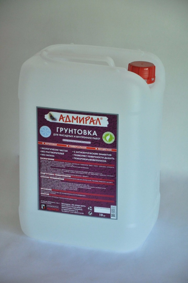 Грунтовка-023 глубокого проникновения Адмирал Предназначена для ответственной подготовки строительных поверхностей под последующую отделку. Укрепляет легкоосыпающиеся и мелящие поверхности. Благодаря наличию ультрамелких частиц укрепляет поверхность на глубину 2-10 мм. Бесцветная, глубокопроникающая, паропроницаемая. Обладает удобной для нанесения консистенцией, укрепляет поверхность и обеспечивает прочную связь с покрытием. Значительно сокращает расход краски или клея, способствует более равномерному нанесению последующих отделочных материалов. Подходит для внутренних и фасадных работ.