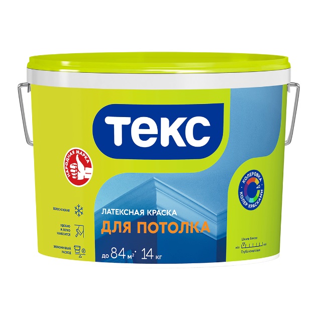Предназначена для окраски потолков и верхних панелей стен внутри сухих помещений по бетонным, оштукатуренным, гипсокартонным, кирпичным, деревянным поверхностям. Краска образует глубокоматовое паропроницаемое покрытие. Рекомендована для использования в детских учреждениях и помещениях административной группы лечебно-профилактических учреждений. Расход на 1 слой 5 - 7 м²/кг - по ровной невпитывающей поверхности; 4 - 6 м²/кг - по неровной впитывающей поверхности; Сухой остаток: 58 %; Плотность: 1,5 - 1,6 кг/л; Разбавитель: вода; Метод нанесения: наносится валиком, кистью или распылением; Время высыхания: 1,5 часа, следующий слой можно наносить через 1,5 часа; Блеск: глубокоматовый; Очистка инструментов: рабочие инструменты промыть водой; Колеровка: да, колер красками Текс; Цвет: белый; Вес: 14 кг. Белый Характеристики