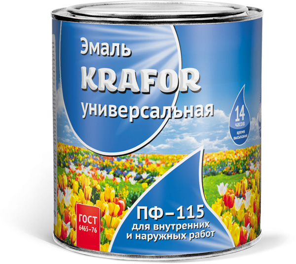 Универсальная атмосферостойкая эмаль ПФ-115 от KRAFOR устойчива к изменению температуры от –50°С до +60°С. Обладает хорошей укрывистостью и сцеплением с поверхностью (адгезией). Предназначена для окраски деревянных, металлических и других поверхностей, подвергающихся атмосферным воздействиям, и для окраски внутри помещений (оконные рамы, двери, кирпичные и бетонные поверхности, ДВП, ДСП). Широкая цветовая палитра.Расход: 100-180 г/м2 на однослойное покрытие, в зависимости от цвета эмали