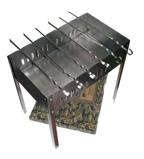 Сборный переносной мангал, изготовленный из высококачественной стали 0,7мм, предназначен для приготовления мяса, птицы, рыбы, овощей на открытом воздухе. На мангале можно расположить 6 шампуров. Мангал хорошо поддерживает жар, не требуя большого количества топлива. Простота и легкость конструкции мангала обеспечивают его быструю сборку и длительную эксплуатацию. В разобранном виде мангал очень компактен, благодаря чему он не занимает много места, например, в багажнике автомобиля.В комплект входит набор из 6 шампуров.