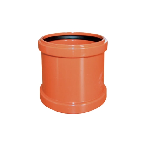 Муфта из ПВХ с двумя раструбами, рыжего цвета, для наружной безнапорной канализацииПредназначена для соединения двух не имеющих раструба труб одного диаметра. Чаще всего применяется при проведении ремонтных работ, отсюда еще одно название — ремонтная надвижная муфта. В случае отсутствия возможности разборки канализационного трубопровода, трубу перерезают, производят необходимый ремонт, и потом отрезанные участки соединяют при помощи надвижной муфты. На обеих сторонах муфты имеются пазухи с вложенным уплотнительным резиновым кольцом. Они позволяют ей при монтаже легко скользить по наружной поверхности труб. Кроме этого, резиновые кольца обеспечивают герметичность соединения. Муфта не является переходником, поэтому соединяемые детали должны иметь одинаковый диаметр.