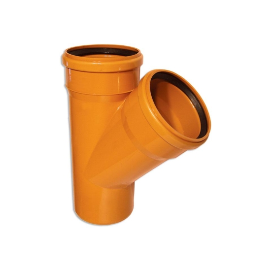 Тройник косой (под 45º) равносторонний из ПВХ, рыжего цвета, для наружной безнапорной канализации Предназначен для создания ответвления в системах канализационных трубопроводов внутри помещений. Угол ответвления равен 45º. Эта модель тройника не является переходником, поэтому все присоединяемые трубы или фасонина должны иметь одинаковый диаметр. Раструб и канавка с уплотнительным резиновым кольцом есть с одной стороны тройника и на боковом ответвлении. Другая сторона гладкая, со снятой фаской, просто вставляется в раструб трубы (или фитинга) соответствующего диаметра.