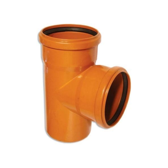 Тройник прямой равносторонний из ПВХ, рыжего цвета, для наружной безнапорной канализации Предназначен для создания ответвления в наружных самотечных (безнапорных) канализационных системах надземного и подземного типов. Угол ответвления прямой, равен 90º. Эта модель тройника не является переходником, поэтому все присоединяемые трубы или фасонина должны иметь одинаковый диаметр. Раструб и канавка с уплотнительным резиновым кольцом есть с одной стороны тройника и на боковом ответвлении. Другая сторона гладкая, со снятой фаской, просто вставляется в раструб трубы (или фитинга) соответствующего диаметра.