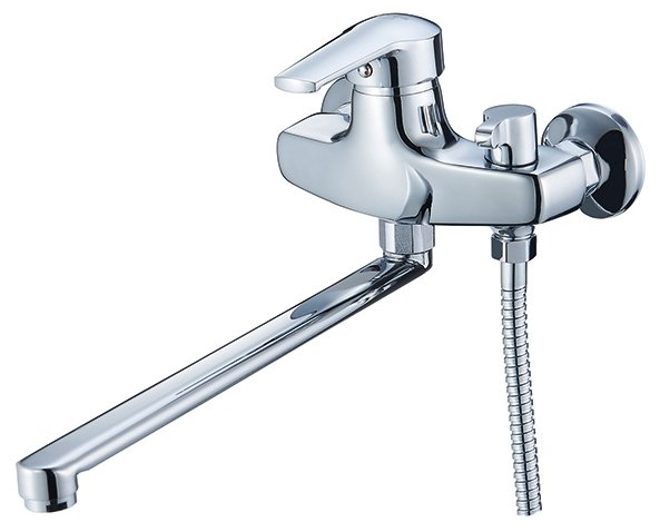 СМЕСИТЕЛЬ G. LAUF серия SIT одноручковыq с длинным поворотным изливом, для ванны и раковины Универсальный смеситель SIT 7-A182 для ванны и умывальника, с четкими геометрическими формами. Излив поворотный, плоский, L-образный, длиной 340 мм. С одной металлической ручкой. В комплекте ручной душ: однорежимная хромированная лейка и металлический шланг. Настенный держатель для душевой лейки. Переключатель ванна/душ поворотного типа встроен сбоку в корпус смесителя. Латунный аэратор. Настенный монтаж, резьбовое присоединение, эксцентрики в комплекте.