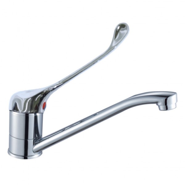Смеситель медицинский ЦС-СМ 27 М44 для мойки и раковиныСмеситель с цельнолитым латунным корпусом для установки на мойку или умывальник. Излив из нержавеющей стали с гальваническим хромированным покрытием, L-образный, поворотный, длиной 225 мм. С одной локтевой металлической ручкой. Ручка тип "44" из металла, посадка «квадрат» 7*7±03 мм, длина 155 мм. Смеситель оснащен внутренним аэратором (нержавейка+пластик). С картриджем D40 мм. Крепеж на гайке. Размер резьбы для присоединения к водопроводу 1/2G. Масса, не более 1,45 кг.