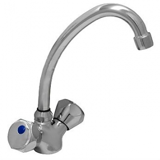 Модель ЦС 120001 МарияСмеситель для мойки и умывальника с высоким поворотным изливом. Излив С -образный, длиной 200 мм, с развальцованным носиком. С двумя ручками из металлизированного пластика. Система крепления при помощи шпильки. Гибкая подводка 1/2″(в комплект не входит).