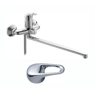 Модель ЦС 300-4 М43 одноручковая с плоским изливом Универсальный смеситель для ванны и умывальника, с поворотным изливом. Излив плоский, L-образный, длиной 320 мм. С одной металлической ручкой. В комплекте ручной душ: пластиковая хромированная лейка и металлический шланг. Настенный держатель для душевой лейки. Переключатель ванна/душ на расположен на корпусе смесителя. Латунный аэратор. Настенный монтаж, резьбовое присоединение.