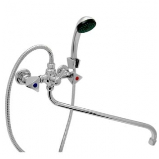 Модель ЦС 270004 ЛючияУниверсальный смеситель для ванны и умывальника, с поворотным изливом. Излив S-образный, длиной 320 мм. С двумя ручками и душевой лейкой из металлизированного пластика. Держатель для душевой лейки настенный (возможен крепеж корпусе смесителя). Флажковый переключатель ванна/душ. Носик с аэратором. Настенный монтаж, резьбовое присоединение.