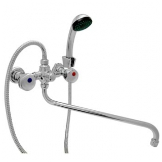 Модель ЦС 270004 МарияУниверсальный смеситель для ванны и умывальника, с поворотным изливом. Излив S-образный, длиной 320 мм. С двумя ручками и душевой лейкой из металлизированного пластика. Держатель для душевой лейки настенный. Флажковый переключатель ванна/душ. Носик с аэратором. Настенный монтаж, резьбовое присоединение.