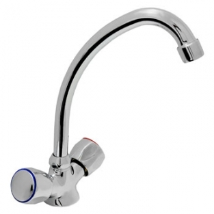 Модель ЦС 120001 ГлобоСмеситель для мойки и умывальника с высоким поворотным изливом. Излив С -образный, длиной 200 мм, с развальцованным носиком. С двумя ручками из металлизированного пластика. Система крепления при помощи шпильки. Гибкая подводка 1/2″(в комплект не входит).