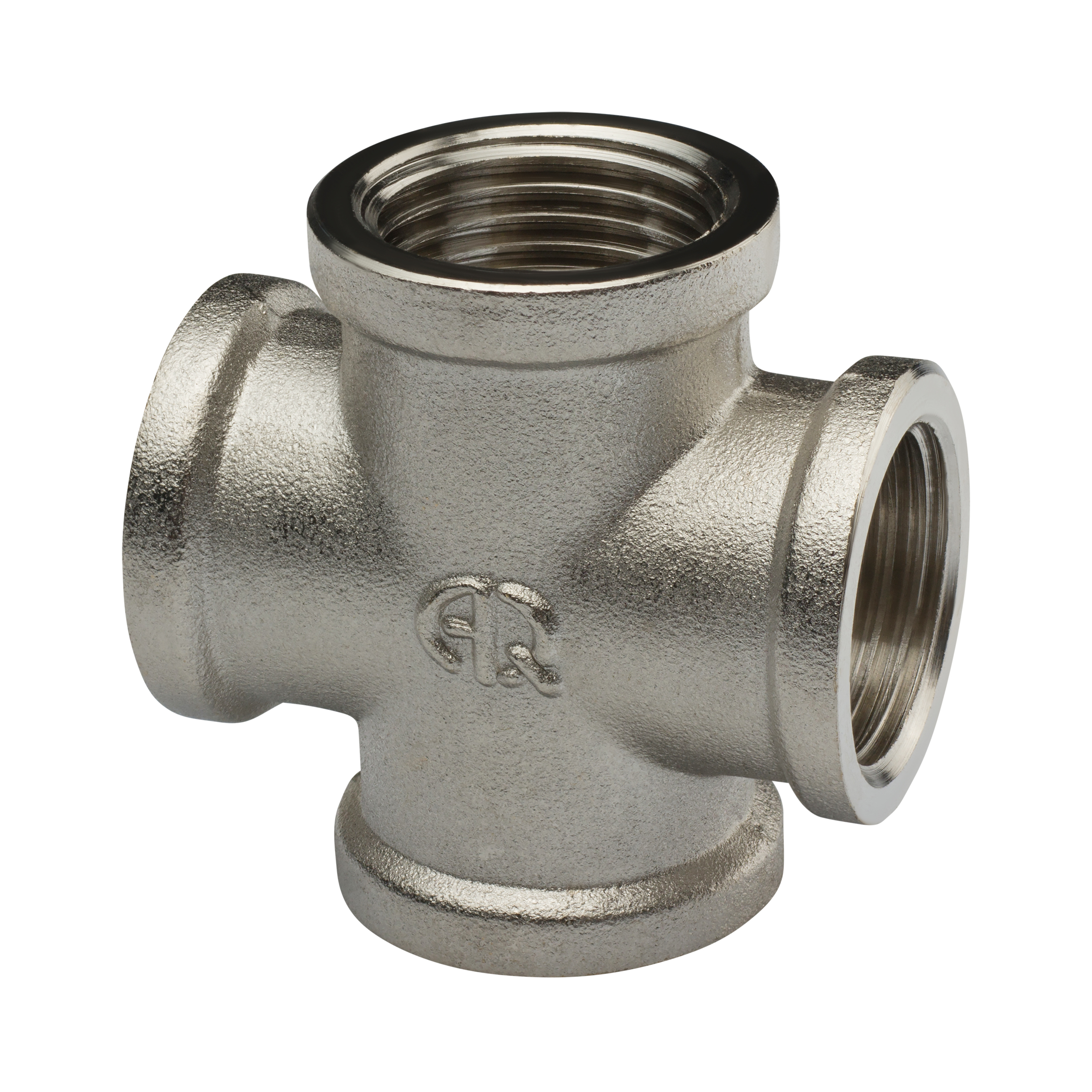 Крест латунный с внутренней резьбой, хромированныйИспользуется в трубопроводных системах для соединения под углом 90º труб одинакового диаметра. Изготовлен из латуни с последующим нанесением резьбы, хромирован. Подходит для систем трубопроводов с неагрессивными средами (природный газ, вода или пар). В продаже крестовина с условным диаметром 15 и 20 мм.
