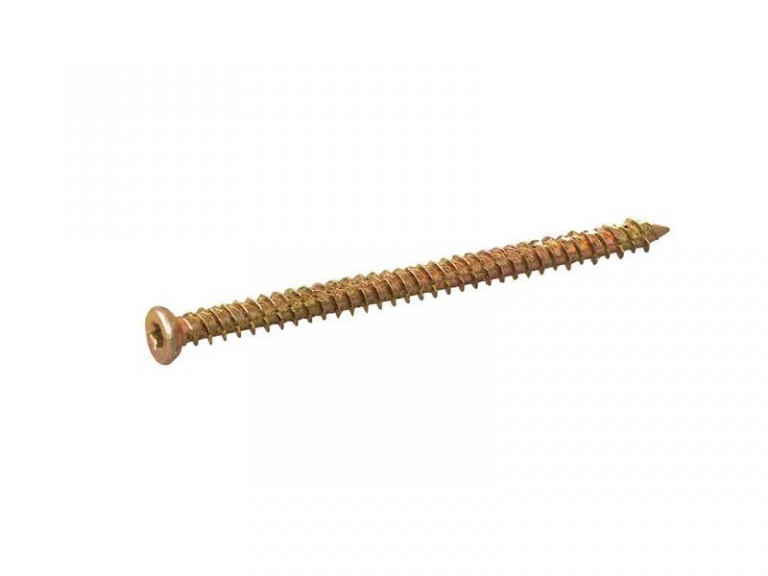 Нагель — шуруп по бетону 7,5*132 (саморез по бетону) с потайной головкойПрименяется для крепления бруса, пластиковых и деревянных окон, дверных коробок к любому твердому основанию. Основанием может быть кирпич, камень, бетон, пенобетон. Дюбель при монтаже шурупов по бетону не используется. Шурупы по бетону (другое название — нагели) изготавливают из стали. После изготовления на нагиль наносится тонкий желтопассивный слой цинка, защищающий шуруп от коррозии. Резьба нагеля специальная, полная. Благодаря наличию полной резьбы, деталь при монтаже не деформируется. Головка — потайная, чаще всего оснащена шлицом Torx. Монтаж производится с зазором. Отверстие соответствующих размеров просверливается заранее, очищается от пыли. Затем шуруп по бетону с потайной головкой вставляют в монтируемую деталь и через неё ввинчивают в просверленное отверстие. Простота и скорость — отличительные особенности такого вида монтажа.
