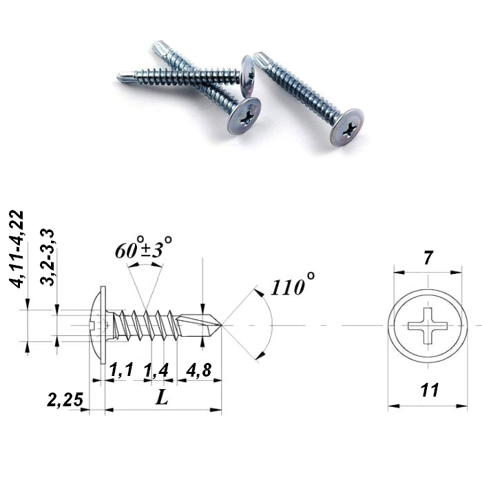 Саморез с прессшайбой острый оцинкованный 4,2*16ммСаморез прессшайба с острым наконечником применяется для крепления в тонком листовом металле. Подходит для крепления в дереве или пластике. Способен монтироваться без предварительного сверления в металле толщиной до 1 мм. Совместно с саморезом можно использовать пластиковый дюбель. Выполнен в виде стержня с частой резьбой. Головка полукруглая (иногда говорят «полуцилиндрическая») с напрессованной шайбой. Способ монтажа самореза с пресшайбой и острым концом следующий: место предполагаемой установки рекомендуется предварительно закернить, если речь идет о креплении в металл. Если общая толщина проходимого металла составляет более 1 мм, отверстие предварительно сверлится. При монтаже, как правило, используется шуруповерт или отвертка с битой размера PH-1 или РН-2. Материал изготовления — сталь, покрытие — белый цинк.