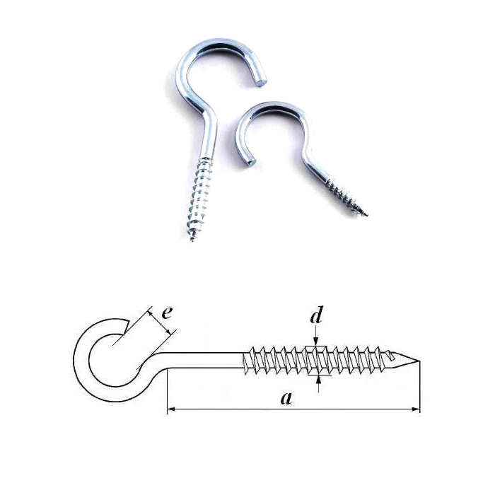 Шуруп с полукольцом 6*80Шуруп «крючок» (или «полукольцо») служит в основном для крепления подвесных конструкций, которые необходимо снимать и вешать в процессе эксплуатации. Часто применяется в быту для крепления бельевых веревок. С его помощью можно крепить стальной трос при растяжке. Выполнен шуруп полукольцо из проволоки. На одном конце нанесена универсальная резьба, а другой изогнут в виде разомкнутого кольца. Шурупы очень хорошо крепятся в дереве, причем закручиваются как с предварительным сверлением так и без него, в зависимости от диаметра шурупа и породы древесины. При монтаже в бетон, кирпич, природный камень, шуруп-крючок устанавливается с использованием дюбеля. Закручивают шуруп руками или с использование небольшого металлического прутка (например, отвертки) продетого через полукольцо. Изготавливается шуруп-кольцо из стальной оцинкованной проволоки.