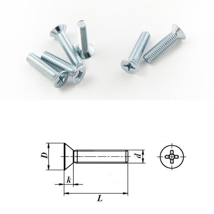 Винт с потайной головкой с крестообразным шлицем 4*40Винт с потайной головкой (потай) с крестообразным шлицем DIN 965 применяют в креплениях, где требуется надежный и скрытый крепеж. Используется в таких отраслях, как машиностроение, приборостроение, строительство, мебельная промышленность. Имеет форму металлического стержня с резьбой по всей длине. Голова винта потайная (выполнена в виде конуса). С наружной части головки имеется шлиц под крест. Установку винта производят с помощью отвертки с крестообразным шлицем или шуруповерта с битой PH. Винт устанавливают в отверстие с резьбой и затягивают по часовой стрелке. Если крепление производят с использованием гайки, целесообразно воспользоваться гровером. Изготавливается винт из углеродистой стали, после проходит гальваническую оцинковку.