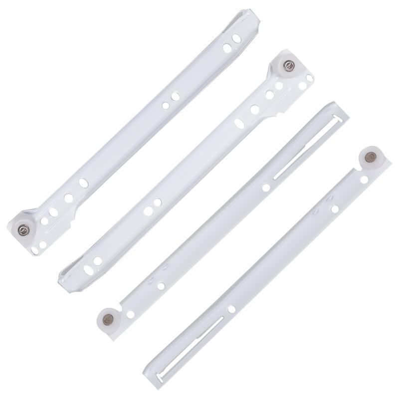 Направляющие роликовые полозки для выдвижных ящиков, комплект, длина 500 ммРоликовые направляющие полозки для выдвижных мебельных ящиков, полок под компьютерную клавиатуру, разделочных досок на кухне. В комплекте два металлических полозка с пластиковыми роликами. Один крепится на корпус, второй на ящик. Ограничений по месту крепления нет. Регулировок нет. Погрешности установки корректируются смещением крепежных саморезов в овальном пазе направляющих. Форма полозков обеспечивает самозакрывание ящика.
