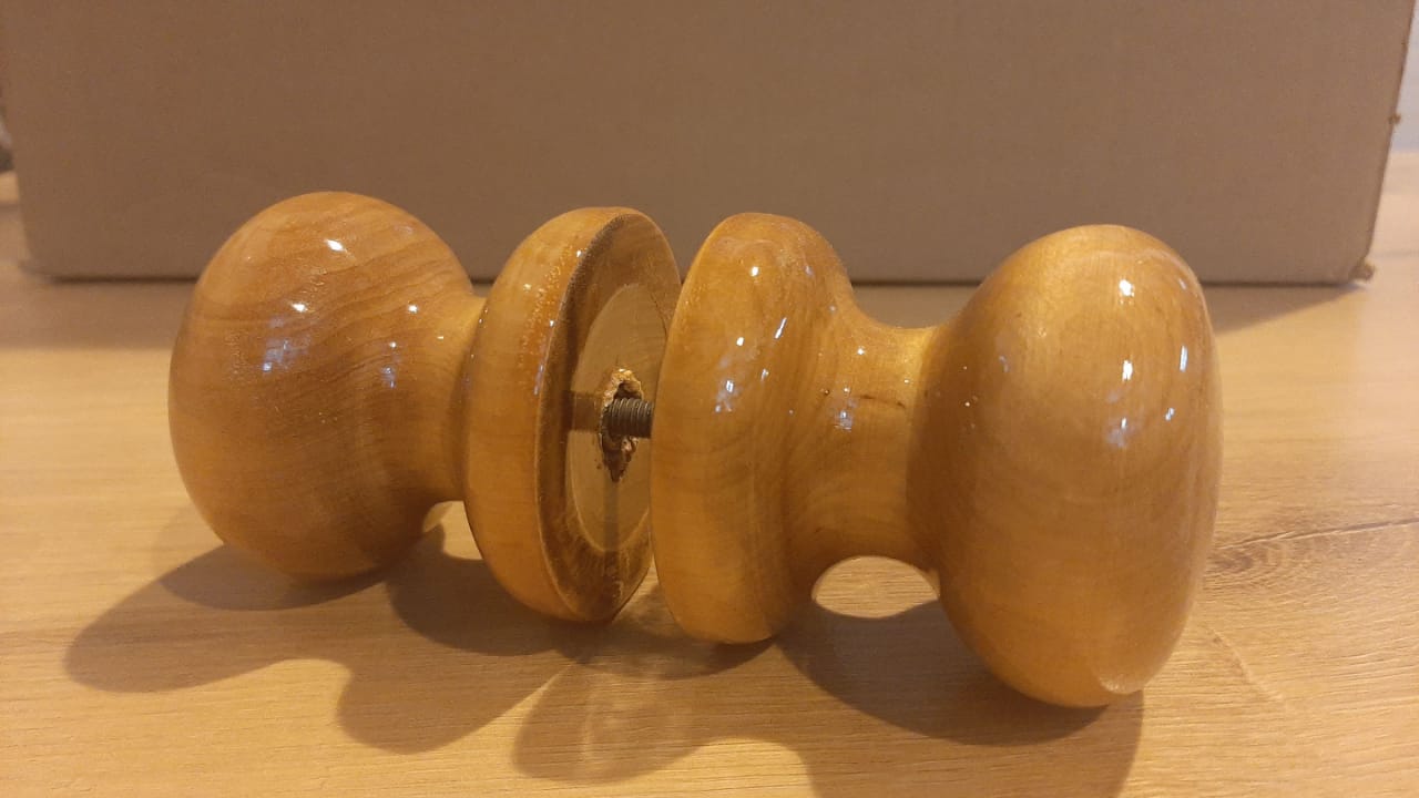 Деревянная ручка с металлической вставкой и основанием-пластиной. Набалдашник круглой формы, средних размеров. Винт, соединяющий обе половинки ручки, 67 мм в длину – достаточно для межкомнатных дверей любой толщины.Подходит для дверей в квартире, доме или на даче.