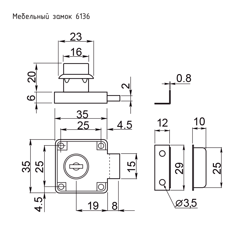 Мебельный замок 6136 предназначен для запирания мебельных створок, дверей и ящиков. Материал изготовления - сталь и сплав ЦАМ. Покрытие - гальваническое многослойное. В комплекте с замком поставляется ответная планка и 2 стальных ключа с пластиковой рукояткой. Характеристики