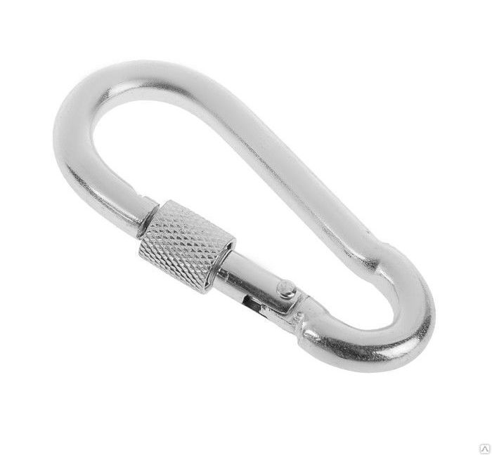 Карабин с фиксатором 10*100ммПредназначен для быстрого и надежного крепления цепей, тросов и канатов между собой или к чему-либо. Имеет винтовой фиксатор, предотвращающий случайное раскрытие карабина.