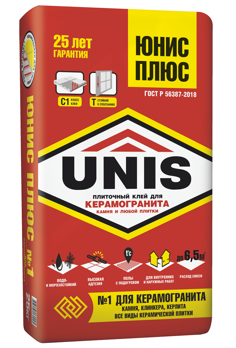 ЮНИС Плюс используется для укладки любых видов керамической плитки, клинкерной плитки, плит из природного и искусственного камня и керамогранита малого и среднего формата на стены, а также керамогранита формата до 60х120 см на полы в любых помещениях. Рекомендуется для системы «Тёплый пол», для крепления керамогранита на фасад, укладки поверх старой плитки.Температура выполнения работ от: +5...+30°С