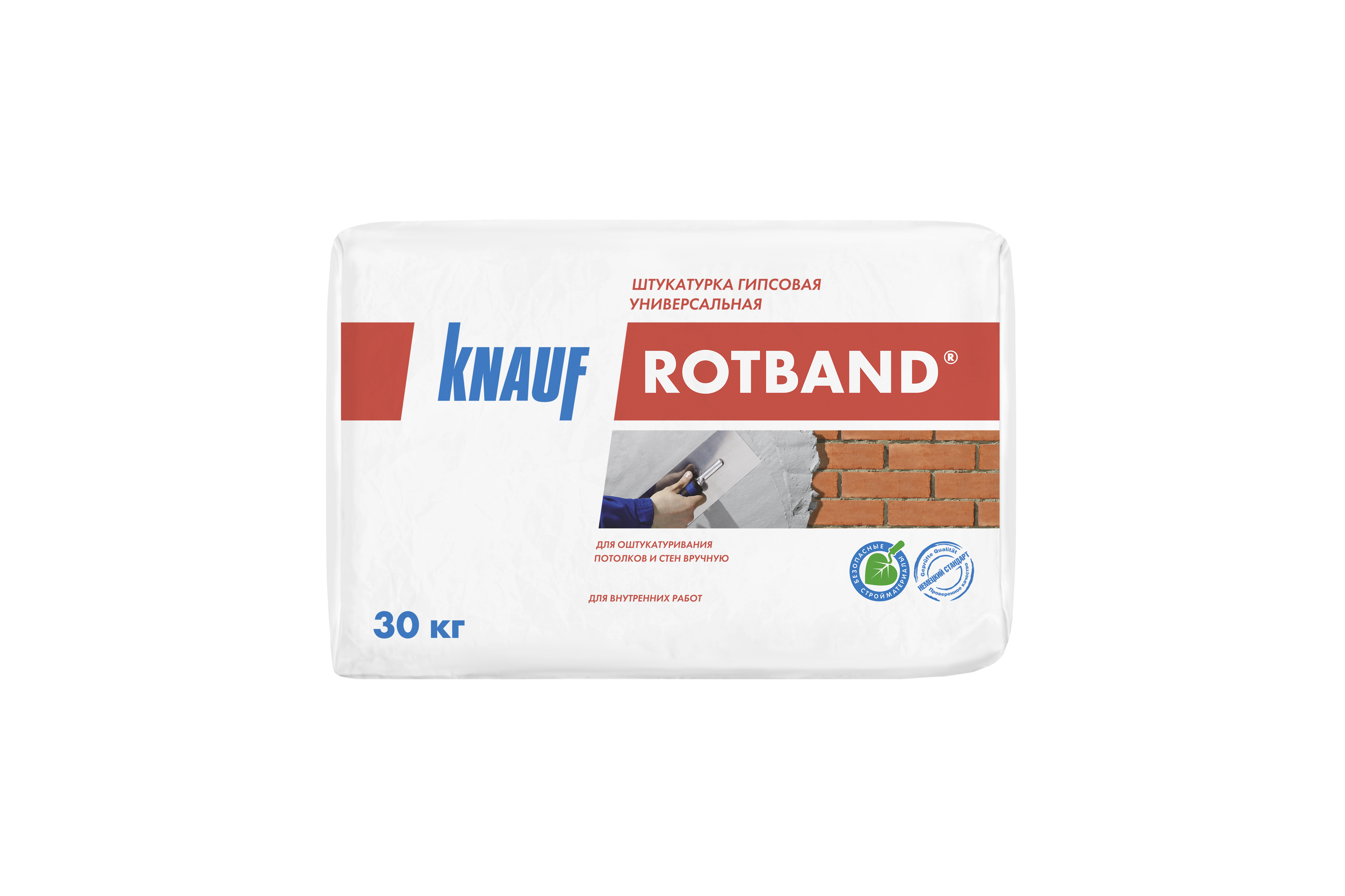 Гипсовая штукатурка РОТБАНД КНАУФ для внутренних работЭто универсальная сухая штукатурная смесь на основе гипса с полимерными добавками, обеспечивающими повышенную клеящую способность — липнет буквально ко всему. Её часто используют для установки «маячков» перед оштукатуриванием — важнейшей операции, от которой зависит общий успех. «Ротбанд» позволяет мастеру длительное время «ловить» размер и уровень, сохраняя при этом пластичность и не отваливаясь от стены — качество, которым могут похвастаться немногие смеси. Производитель позиционирует «Ротбанд», как смесь «для высококачественного оштукатуривания потолков и стен с обычным твердым основанием, например, таких как, бетон, кирпич, цементная штукатурка, а так же поверхностей из пенополистирола, ЦСП». Рекомендуется для гладких бетонных потолочных и стеновых поверхностей. Можно использовать для отделки помещений с нормальной влажностью, а также в кухнях и ванных.