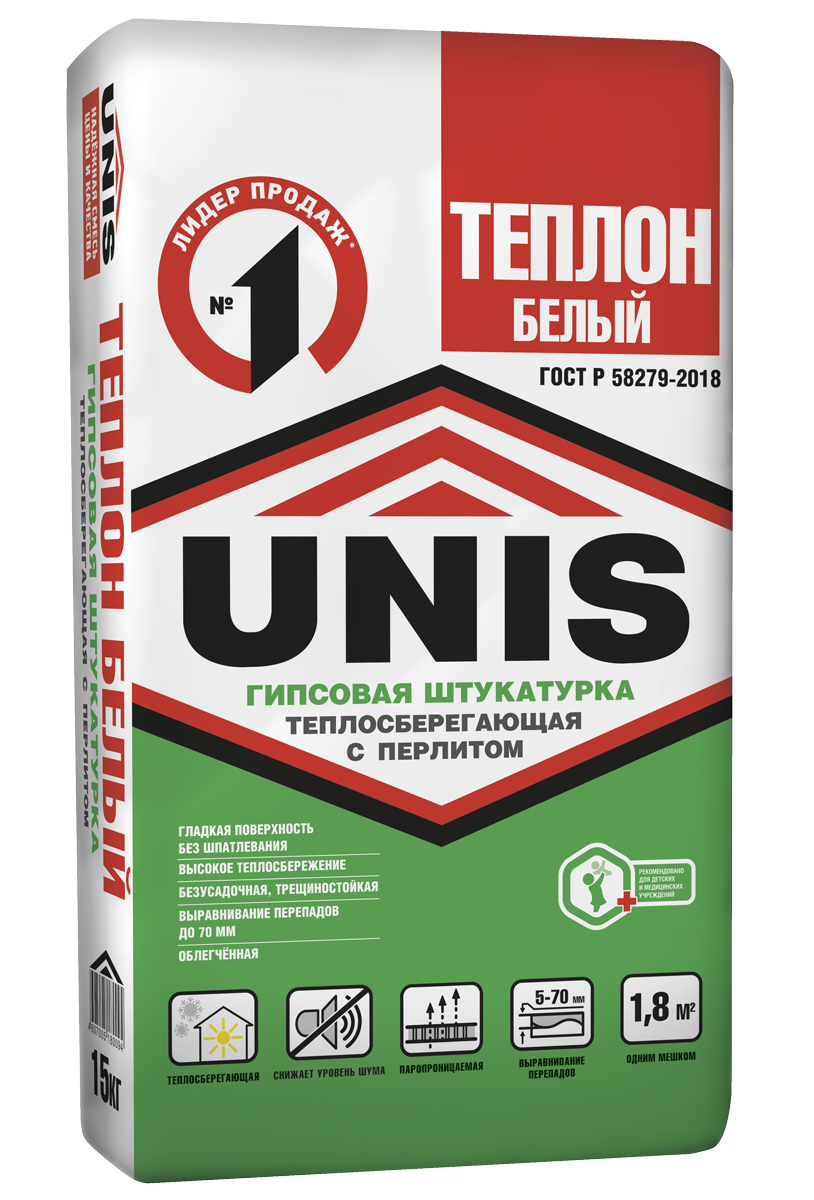 Гипсовая штукатурка Юнис Теплон белый для внутренних работЛёгкая теплоизолирующая смесь ТЕПЛОН на основе гипсового вяжущего предназначена для сплошного или частичного выравнивания поверхностей стен и потолков внутри жилых и общественных помещений с умеренной влажностью под последующую декоративную отделку: оклейку обоями, окрашивание, облицовку керамической плиткой. Отделка поверхностей во влажных отапливаемых помещениях производится только под последующую облицовку керамической плиткой при условии тщательной затирки межплиточных швов. Выравнивает перепады до 70 мм, пластична, удобна в работе. Дает гладкую поверхность (возможно глянцевание).