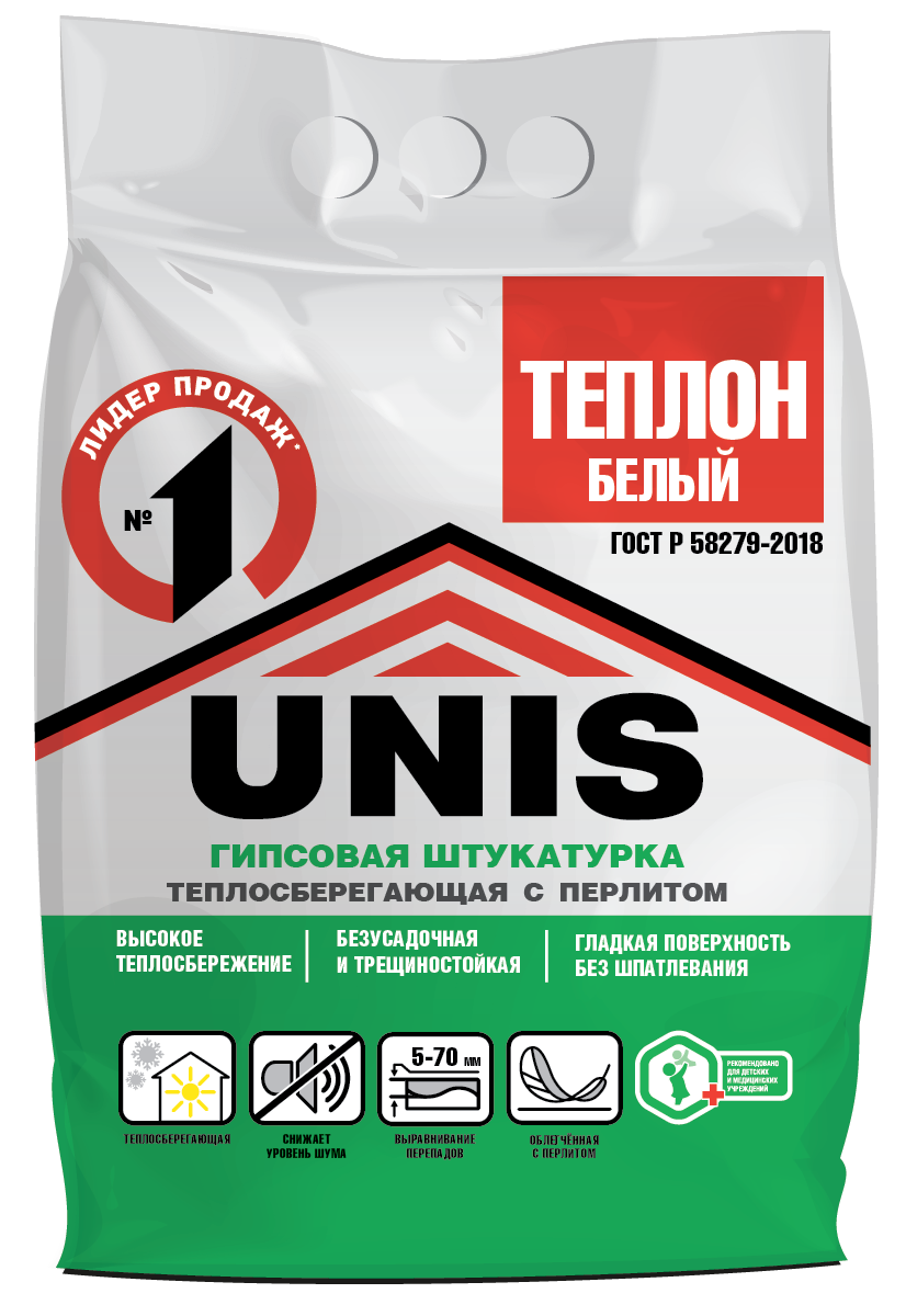 Гипсовая штукатурка Юнис Теплон белый для внутренних работЛёгкая теплоизолирующая смесь ТЕПЛОН на основе гипсового вяжущего предназначена для сплошного или частичного выравнивания поверхностей стен и потолков внутри жилых и общественных помещений с умеренной влажностью под последующую декоративную отделку: оклейку обоями, окрашивание, облицовку керамической плиткой. Отделка поверхностей во влажных отапливаемых помещениях производится только под последующую облицовку керамической плиткой при условии тщательной затирки межплиточных швов. Выравнивает перепады до 70 мм, пластична, удобна в работе. Дает гладкую поверхность (возможно глянцевание).