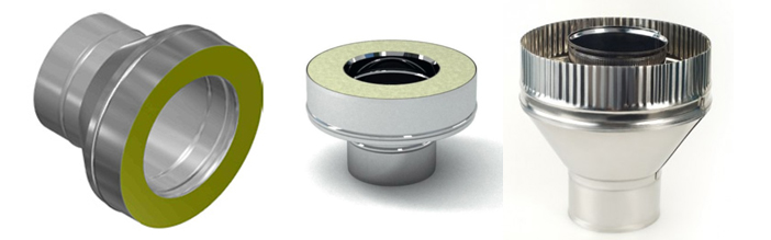 Элемент для двойного дымохода со слоем теплоизоляции. Используется для перехода с одностенных на двухстенные дымоходы.Вид элемента: старт-сэндвич (адаптер котла)